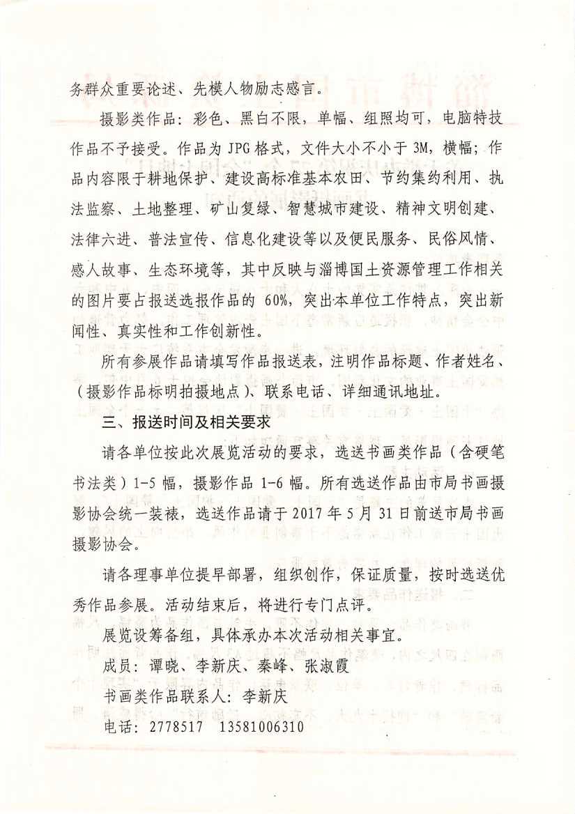 现将市局《关于举办庆祝第27个“全国土地日”书画摄影展的通知》转发给你们。请按通知要求组织本单位职工积极创作,并于5月19日前将书画作品报送局办公室,摄影作品及报送表发送至局办公室邮箱。届时县局将举办书画摄影展,并选送优秀作品,参加市局展览。报送展览情况列入年度目标责任考核。