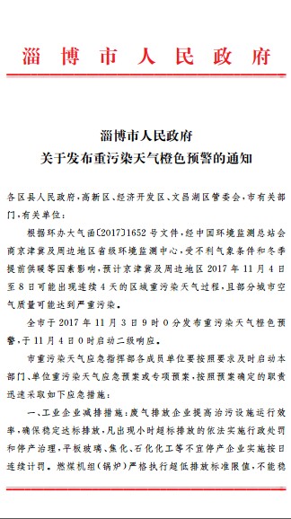 淄博市人民政府关于发布重污染天气橙色预警的通知